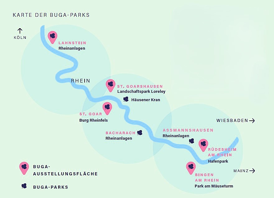 Výstava BUGA 2029 chce celé údolí Středního Porýní zaplavit květy. Podél přibližně 67 kilometrů toku Rýna vznikne osm BUGA parků s pěti placenými výstavními plochami, doplněnými o výrazná místa pro kulturní a společenské akce. Celý koncept je navržen tak, aby návštěvníci mohli krajinu objevovat postupně, vlastním tempem a podle vlastních zájmů.
