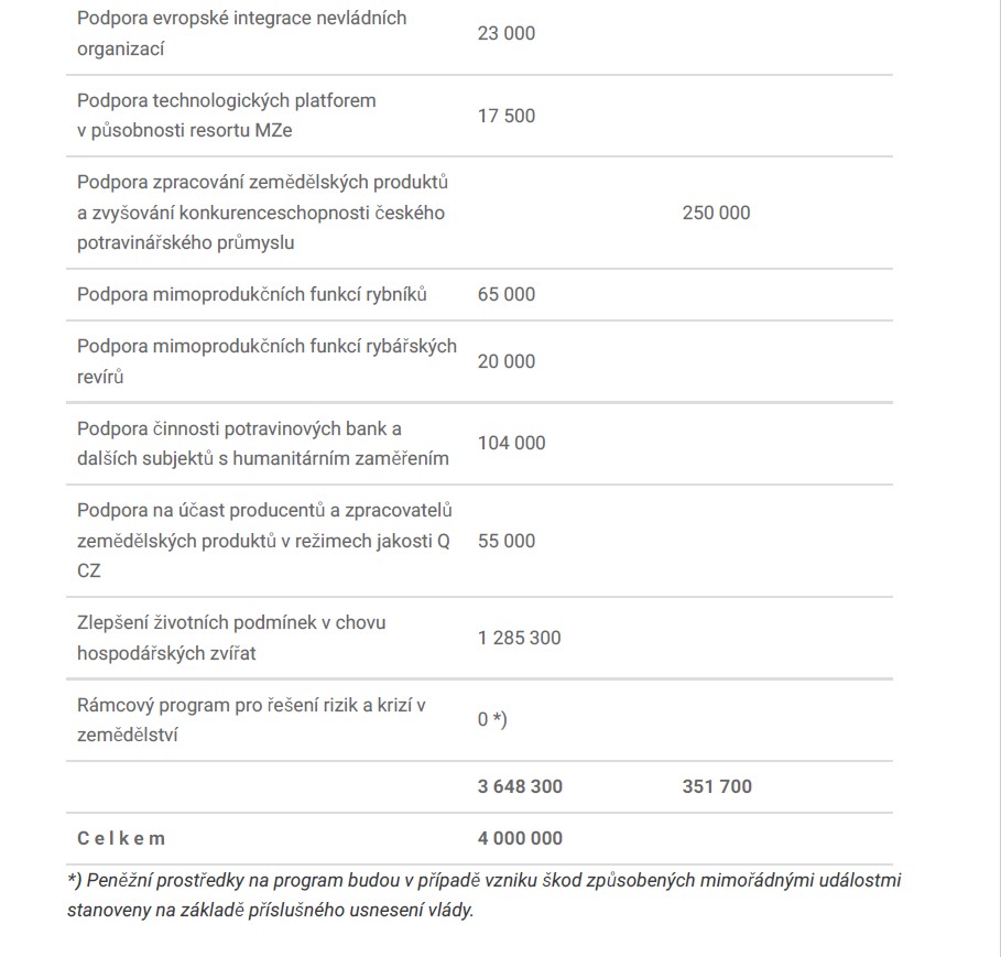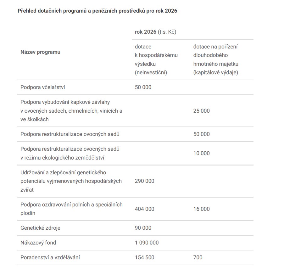 Ministerstvo zemědělství letos rozdělí čtyři miliardy korun z národních zdrojů. Největší část podpoří chovy hospodářských zvířat, prevenci nákaz, ozdravování plodin a návrat investic do zpracování.