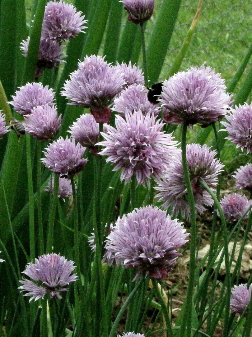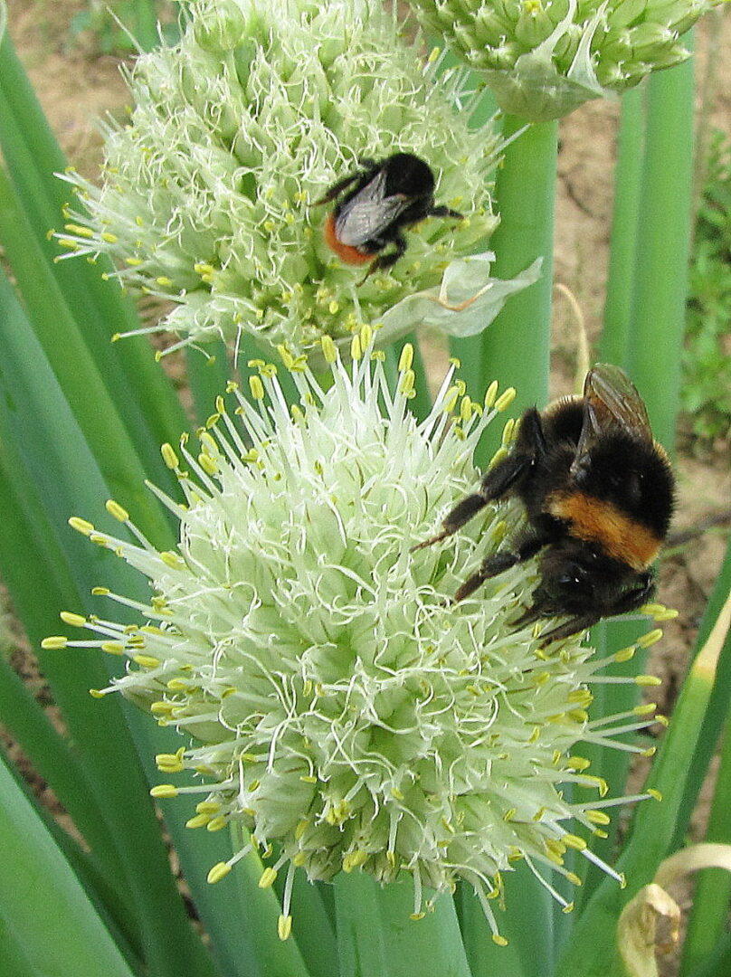 čmeláci na kvetoucí cibuli